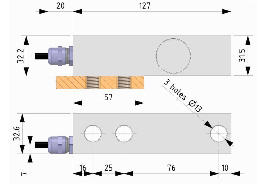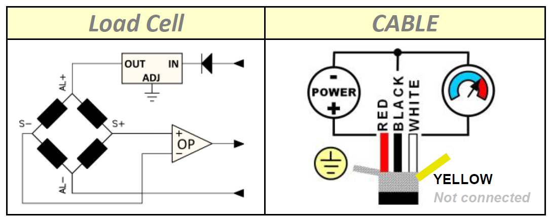 VC 105°C shielded cable, Ø5.2mm with 4 tinned Ø0.35mm2 conductors. Shield connected to the body of the load cell.