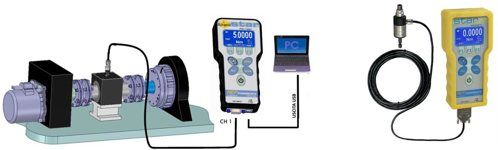 Star with external(1) sensors such as TRX, TRS, RT2, uTOR models to measure static or dynamic TORQUES with standardized ranges from 1 up to 5000 Nm.