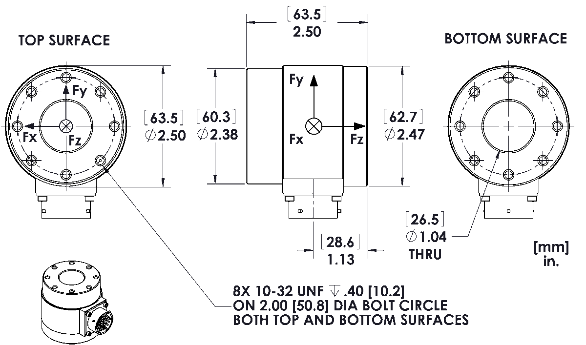 | Fx, Fy, Fz Hysteresis | < 1% Full Scale Output |