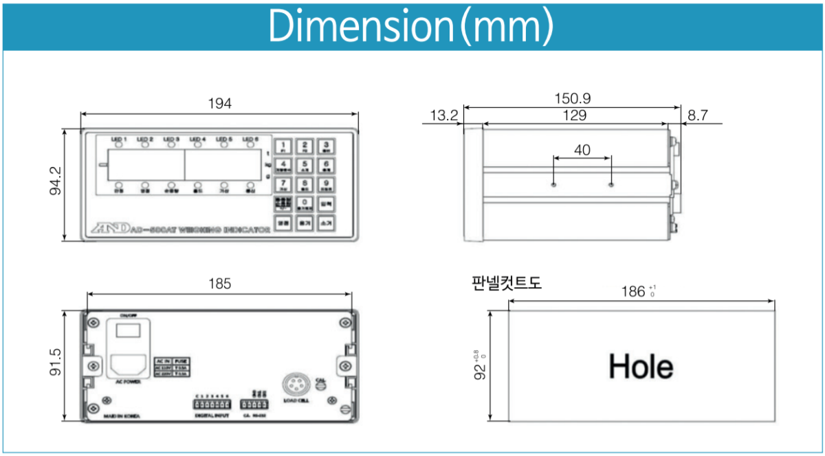 | 표시부 | 메인계량표시부 : 7세그먼트 적색 LED 6행. 부(-) 극성용 적색 LED 1행 (문자크기 20mm) |