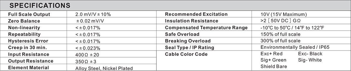 - Full Scale Output: 2mV/V ± 10%