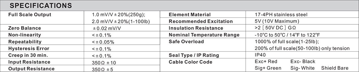 - Full Scale Output: 1.0mV/V ± 20% (250g); 2.0mV/V ± 20% (1-100lb)