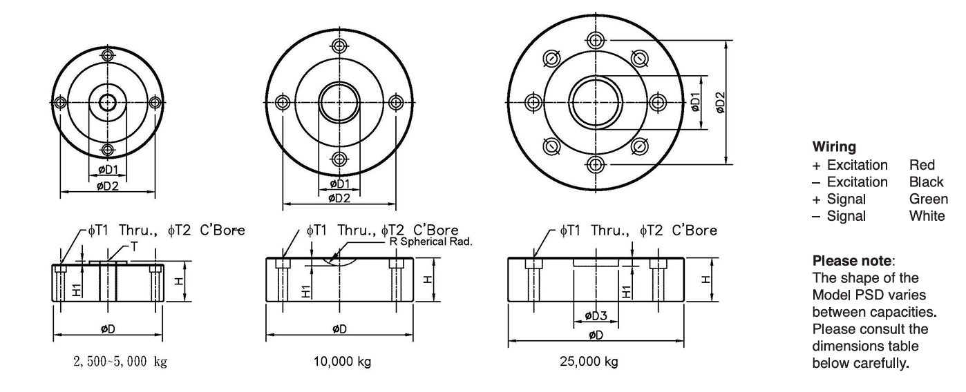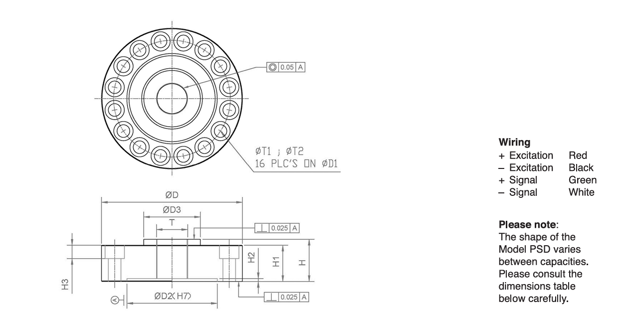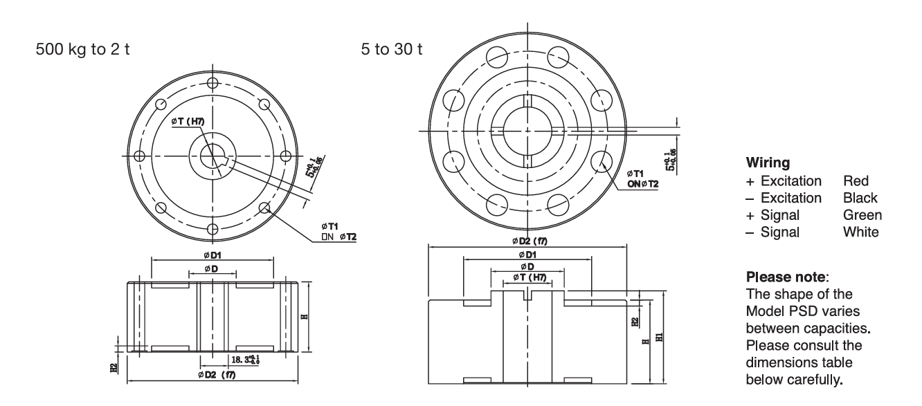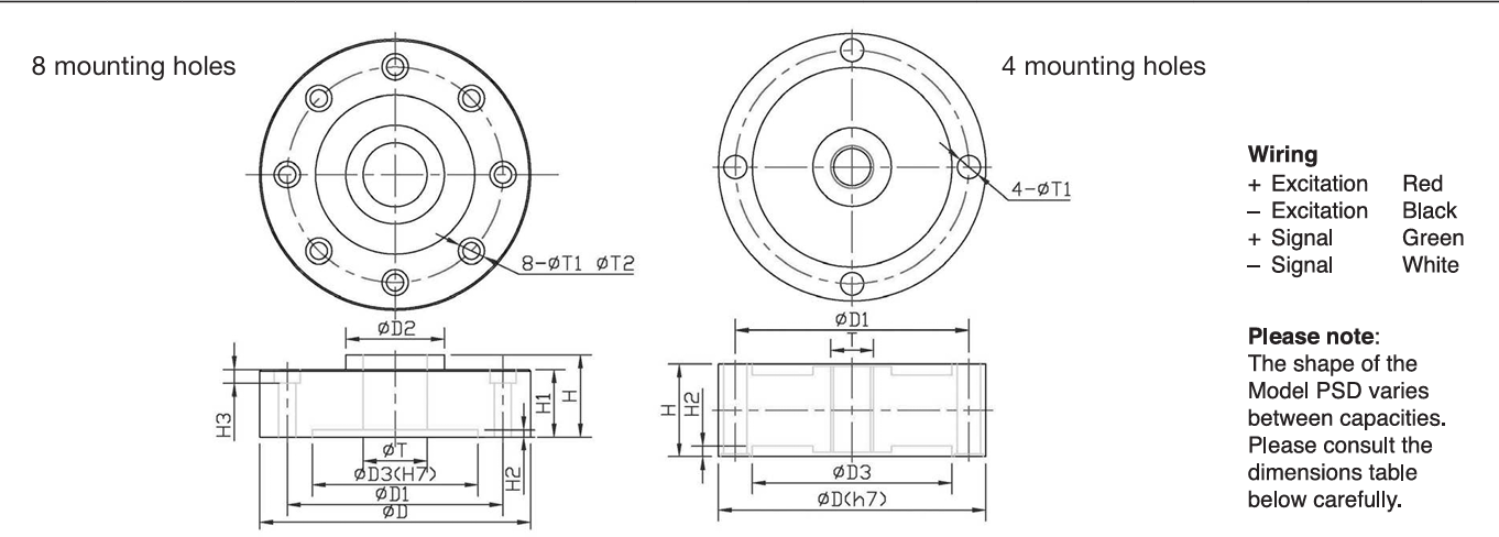 The model PSD is a precision shear web disk, a specialized compression load cell. A low proile design makes the PSD the most suitable application when height is a primary safety concern. The shear web design provides excellent performance even when side forces are inevitable in normal operations. A typical example would be in motor truck scales. The PSD is fully potted with special chemical compounds to the IP67 standard. This protects the cell from water and moisture attack. The PSD-SJTT and PSD-SJTH are low-proile compression disks specially designed for testing machines.