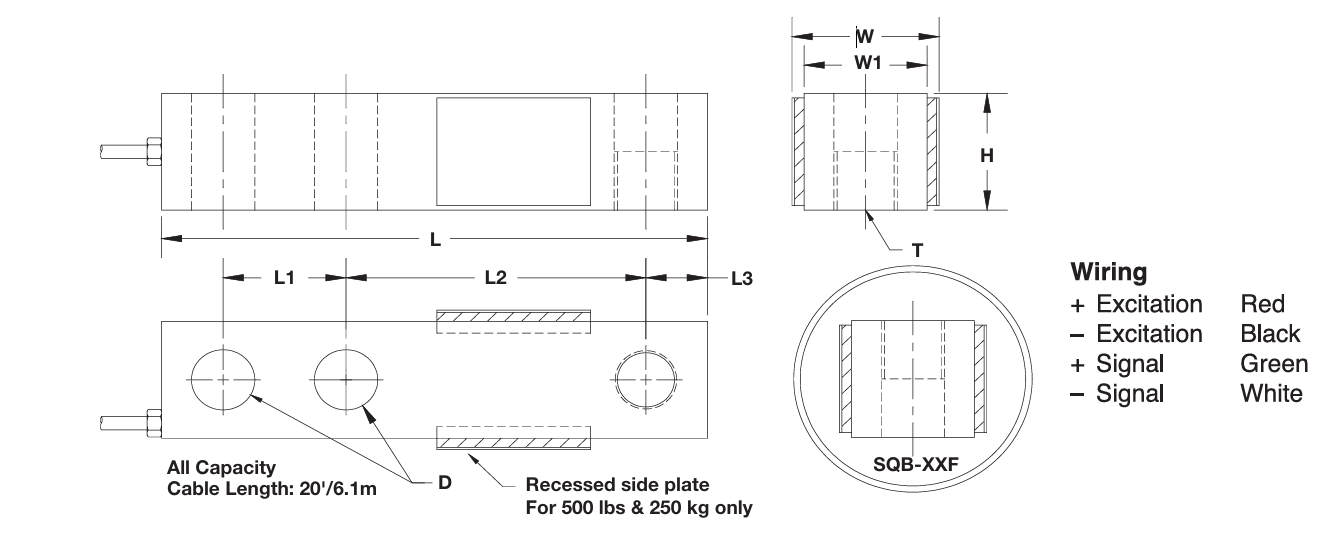 | CAPACITY | L (mm/in) | L1 (mm/in) | L2 (mm/in) | L3 (mm/in) | W (mm/in) | W1 (mm/in) | H (mm/in) | D (mm/in) | T | Rated output (R.O.) | Tolerance | Zero balance | Non-linearity | Hysteresis | Non-repeatability | Creep error | Zero return | Temp effect min dead load | Temp effect sensitivity | Safe overload | Ultimate overload | Input Impedance | Output Impedance | Insulation | Construction | Env. Protection |