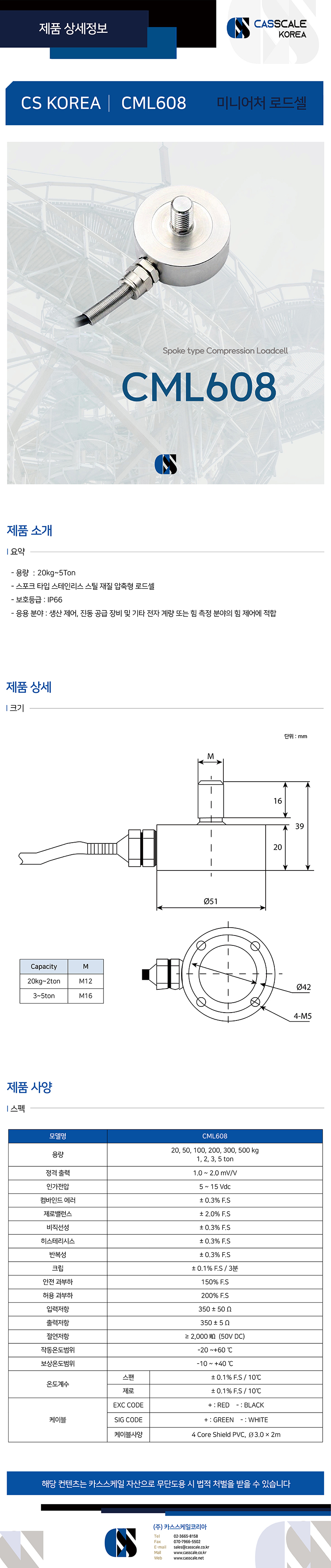 미니어처타입 압축 로드셀 CML608 CML608-20, 50, 100, 200, 300, 500kg CML608-1T, 2T, 3T, 5T 스테인레스스틸 (SUS) 인장압축형 미니어쳐 로드셀