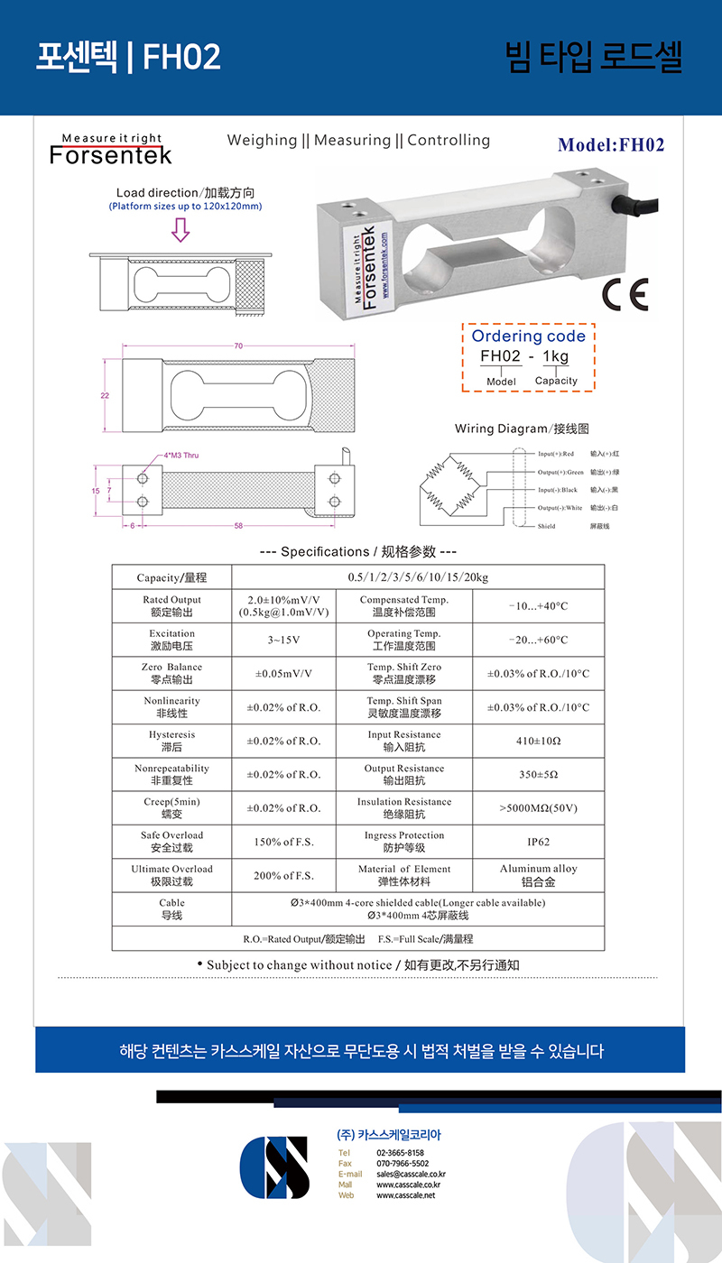 Small size load cell sensor FH02 is made of aluminum alloy based on strain gauge technology.Weight sensor FH02 offers 0.5kg / 1kg / 2kg / 3kg / 5kg / 6kg / 10kg / 15kg / 20kg nine rated capacities to choose from.Model FH02 is temperature compensated to deliver stable readout throughout the working temp. range.Single point load cell FH02 is corner trimmed for platform sizes up to 120x120mm,suitable for off-center load measurement.Beam loadcell FH02 is widely used for bench scales,counting scales and other weighing devices.Custom design service is available to meet requirements of different applications.