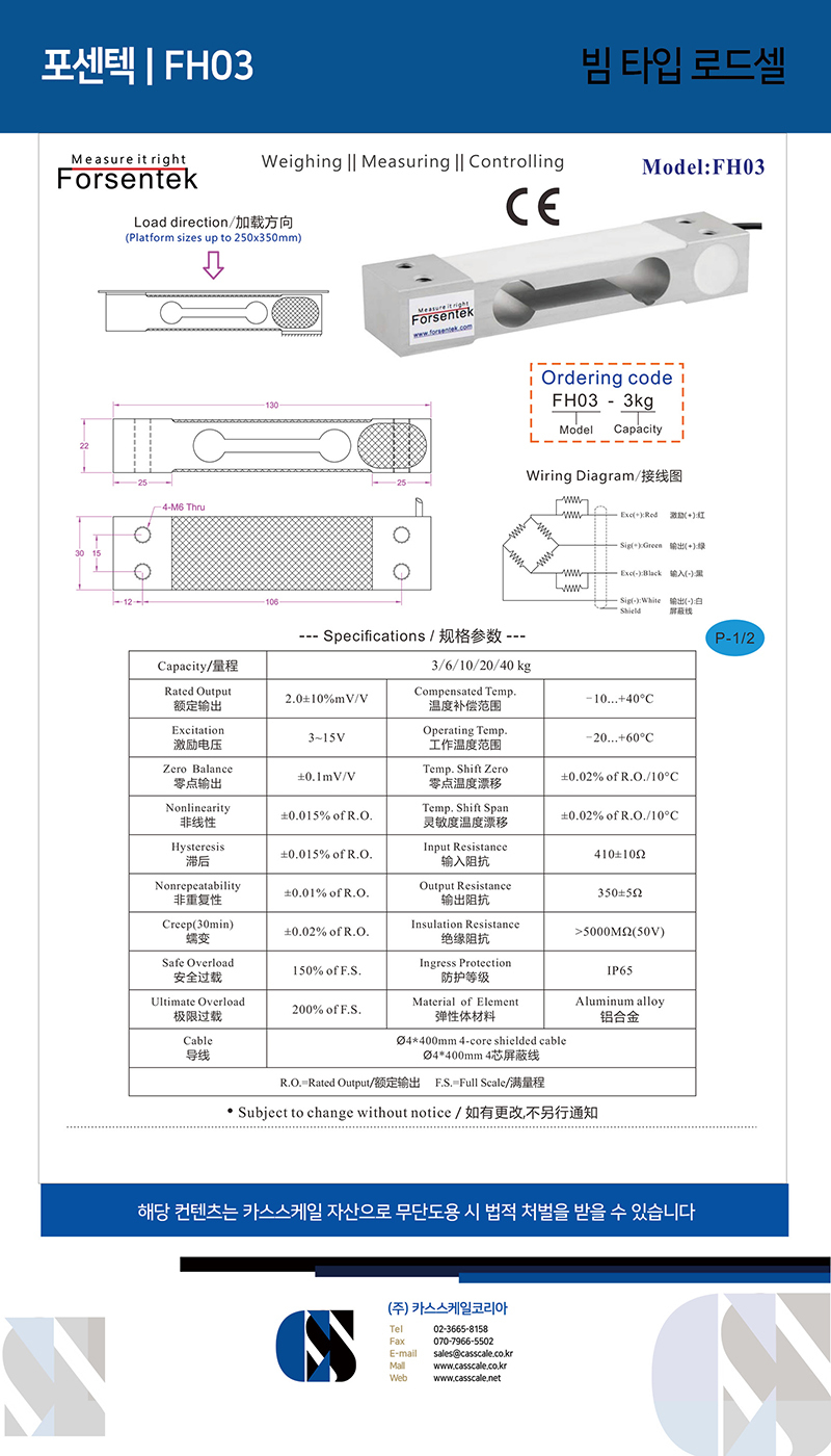 High accuracy load cell FH03 utilizes strain gauge technology.Load sensor FH03 offers 3kg / 6kg / 10kg / 20kg / 40kg five rated capacities with maximum 0.015% non-linearity of the full scale to choose from.To achieve stable measuring results,model FH03 is temperature compensated.Weight sensor FH03 is corner trimmed for platform sizes up to 250x350mm, which makes it suitable for weight measurement where load center is not constant.You may find transducer FH03 applicable for bench scales,electronic scales and other industrial weighing applications.