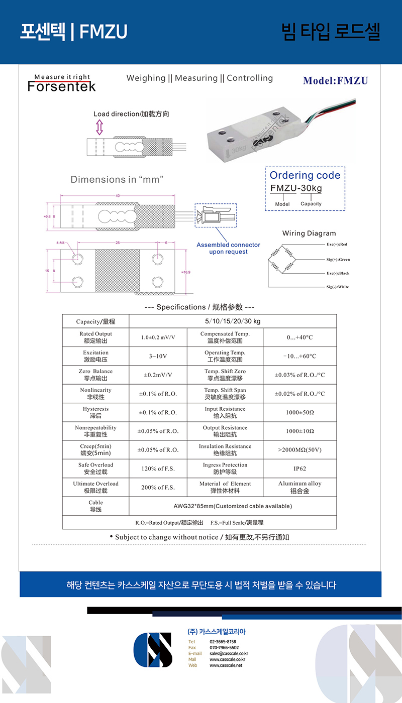Low cost load cell sensor FMZU offers 5kg/10kg/20kg/30kg measuring range with the same mounting dimensions, unamplified mV/V output from wheatstone full bridge with maximum non-linearity of 0.1% R.O. which makes it suitable for weight measurement applications with limited space without compromising the measuring accuracy.