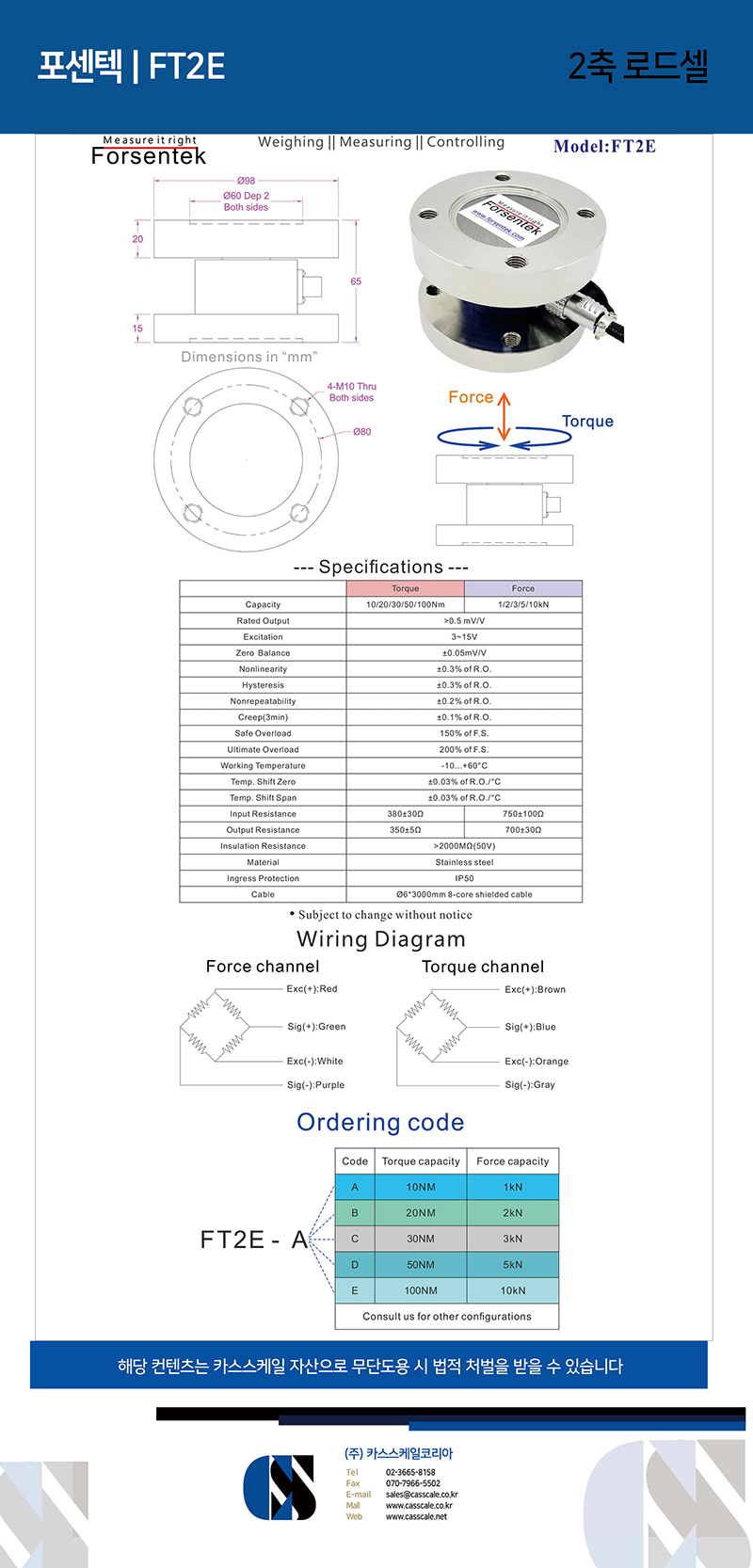 Torque and thrust biaxial load cell FT2E is designed to measure reaction torque moment as well as tension and compression force.Torque thrust sensor FT2E is metal foil strain gauge based and has two separate outputs for applied torque and thrust force. Stainless steel construction, flange-to-flange mounting, you may find bi-axial force sensor FT2E suitable for applications such as grinding and polishing, robotic assembly, product testing and so on. Transducer FT2E can also be modified or customized upon request.