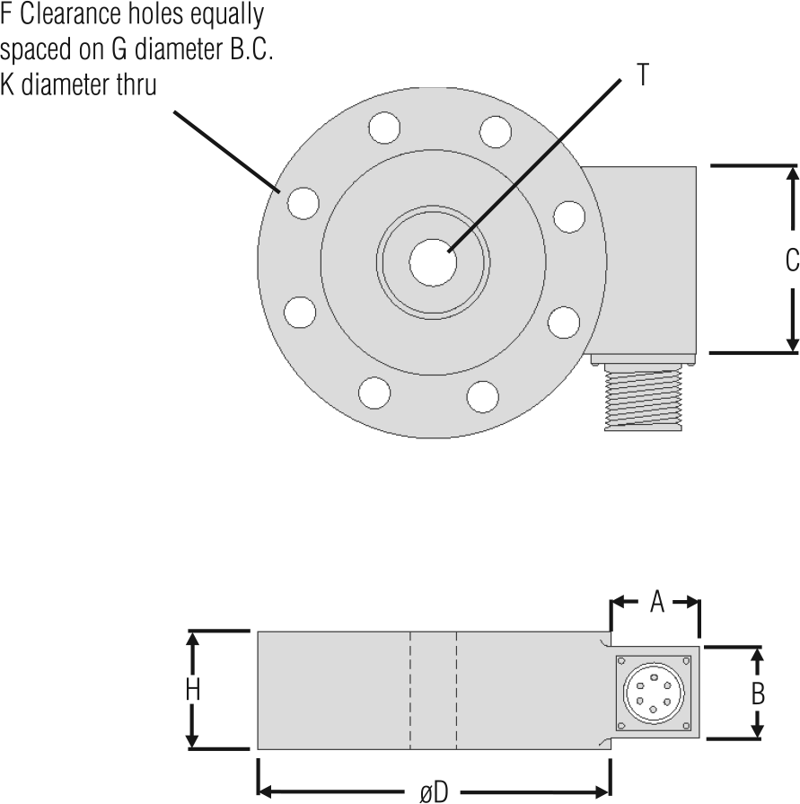 | Ranges (lb) | D mm [in] | H mm [in] | H* mm [in]** | F# ØG mm [in] | B.C. ØK mm [in] | thru T | A mm [in] | A mm [in]* | B mm [in] | B mm [in]* | C mm [in] |
