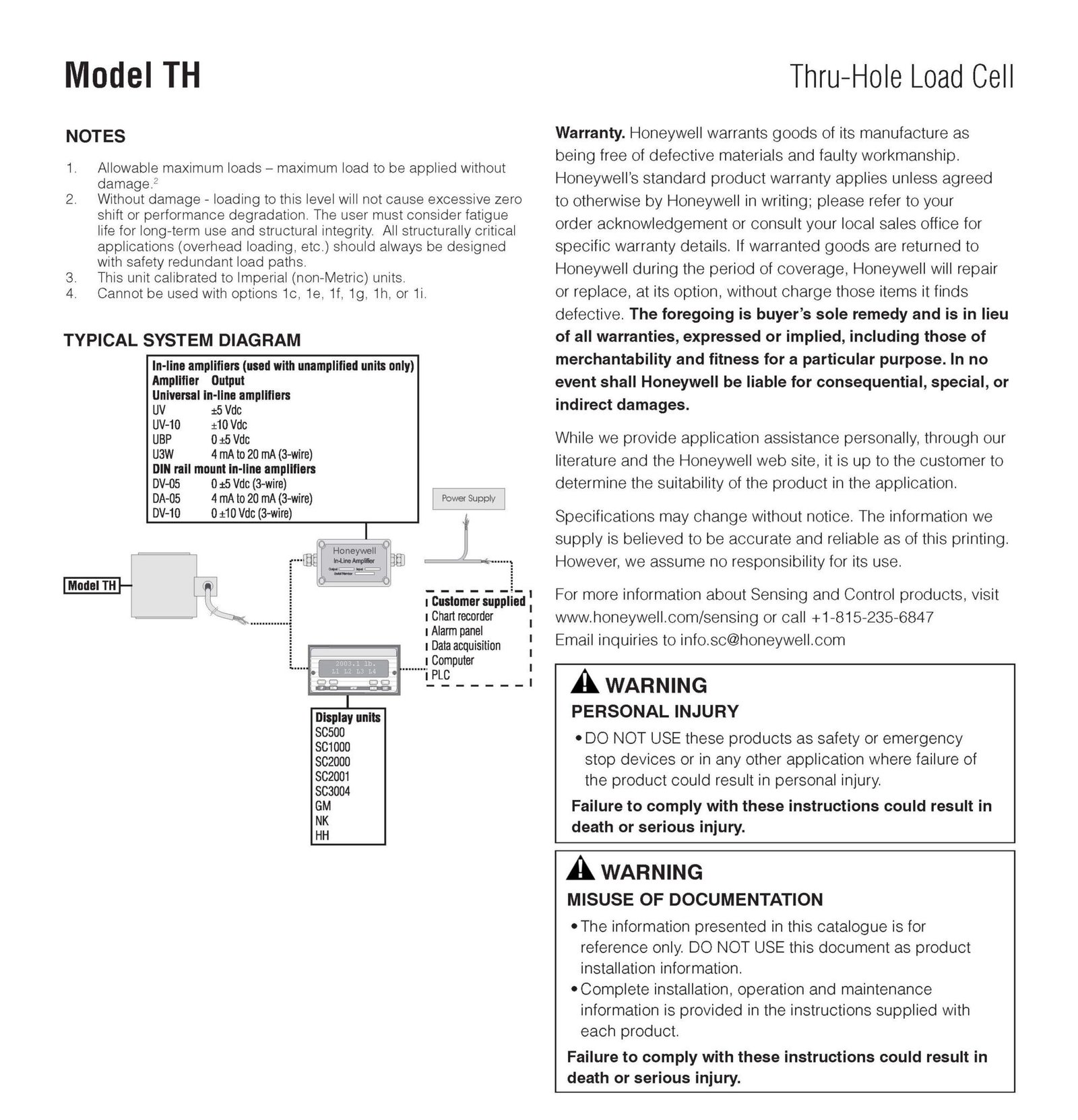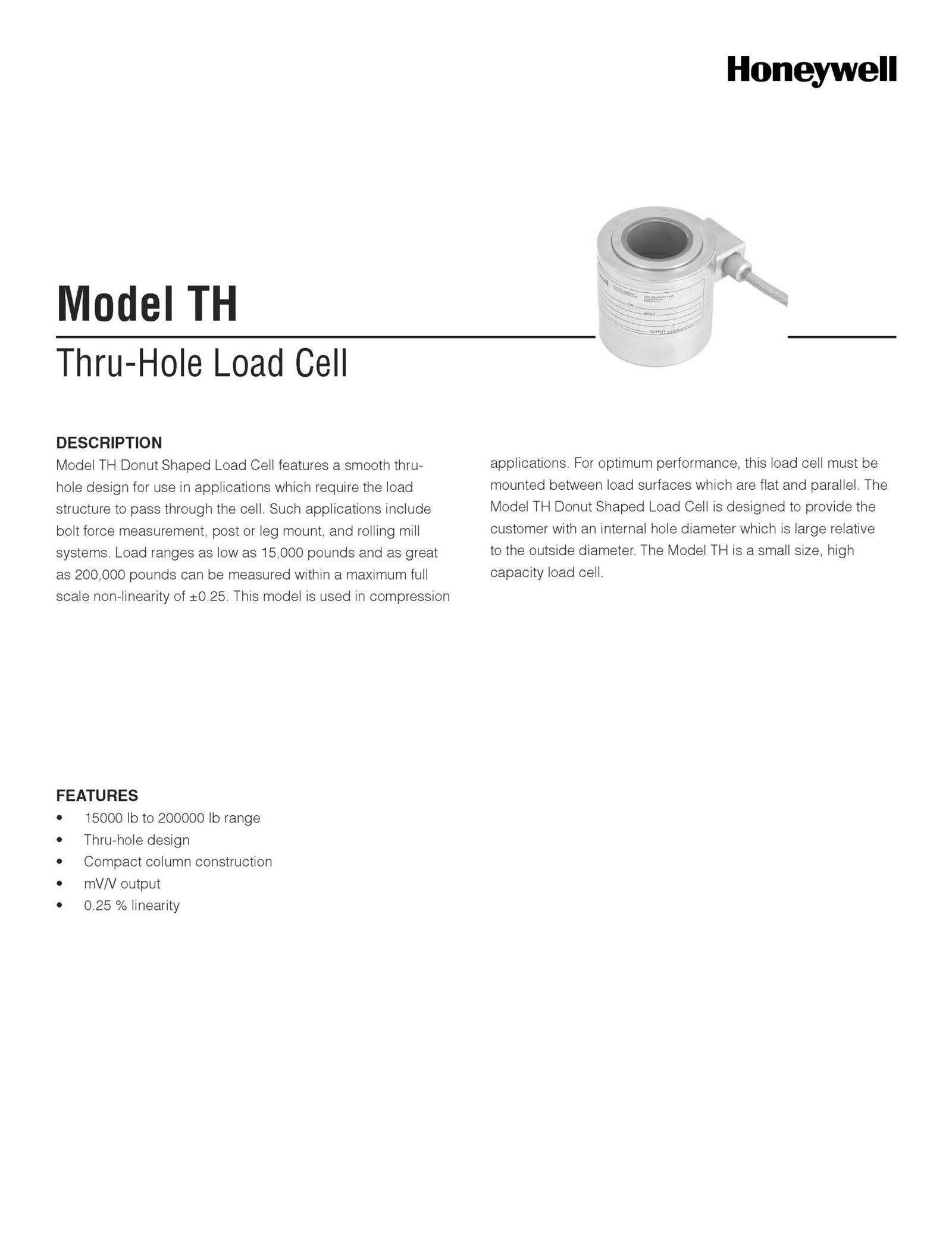 Model TH Donut Shaped Load Cell features a smooth thru-hole design for use in applications which require the load structure to pass through the cell. Such applications include bolt force measurement, post or leg mount, and rolling mill systems. Load ranges as low as 15,000 pounds and as great as 200,000 pounds can be measured within a maximum full scale non-linearity of ±0.25. This model is used in compression applications. For optimum performance, this load cell must be mounted between load surfaces which are flat and parallel. The Model TH Donut Shaped Load Cell is designed to provide the customer with an internal hole diameter which is large relative to the outside diameter. The Model TH is a small size, high capacity load cell.