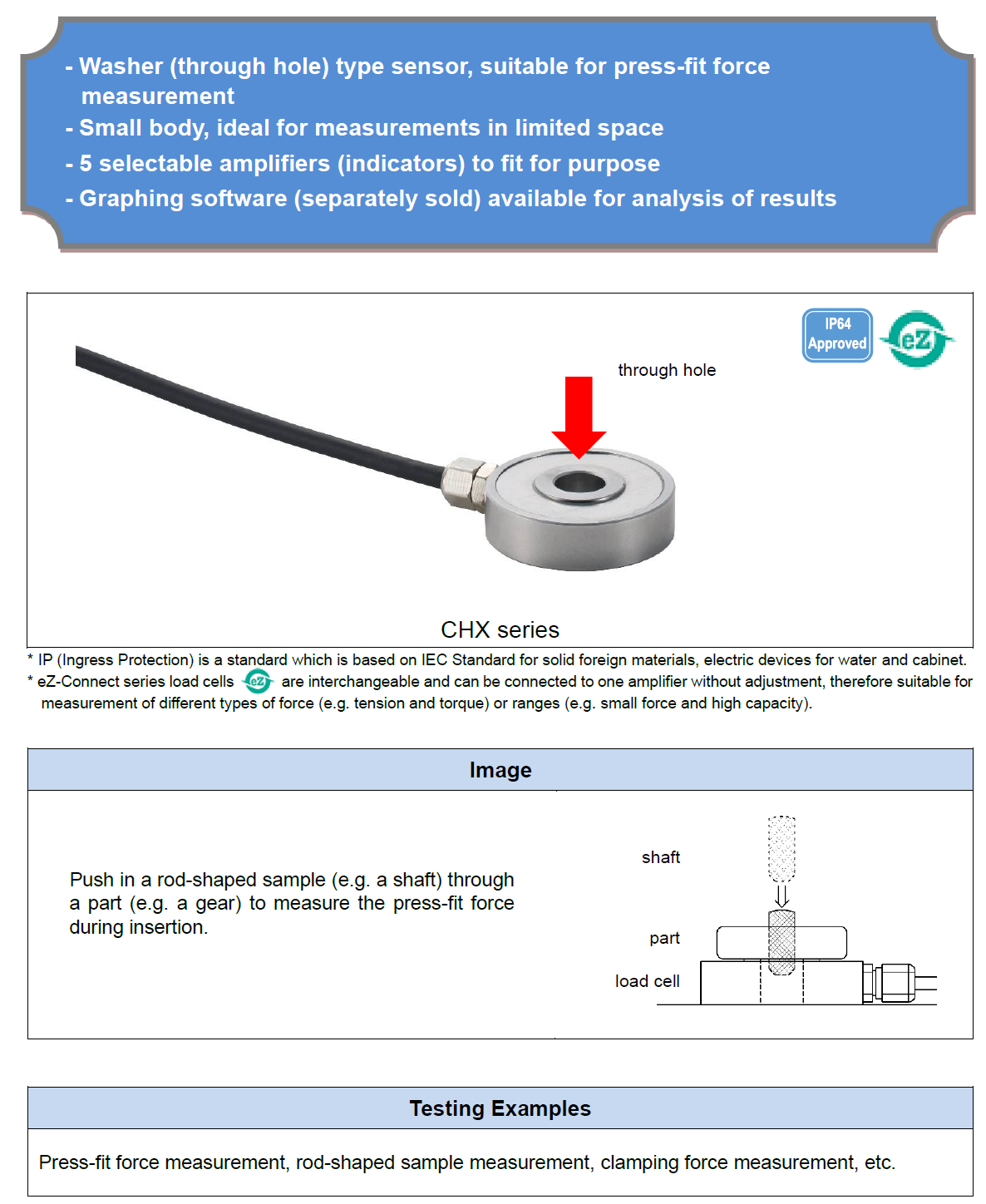 - Ideal for press-fit force measurement due to the washer (through hole) design