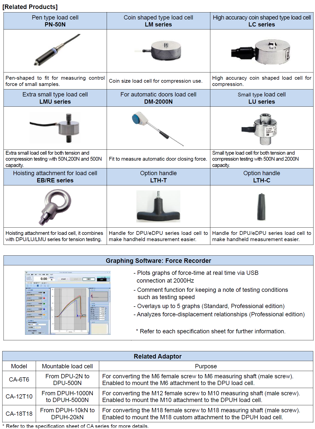 Standard-type load cell has capacity of 500N, and is rectangular shaped which can be easily integrated into an external equipment. A jig is attached to the measuring shaft (threaded part).