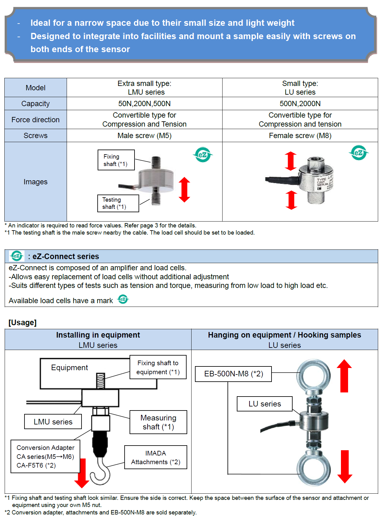 • Separated sensor model force gauges with a dedicated sensor available for a certain measurement purpose