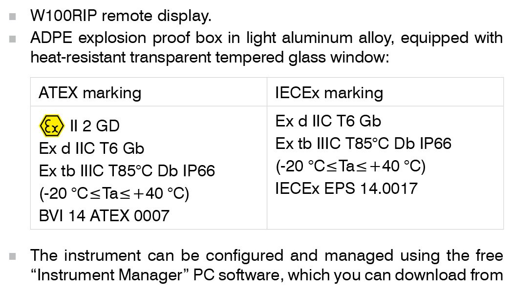 – Remote display series W100RIP – Explosion proof box, ATEX II 2 GD approved, provided with heat-resistant transparent tempered glass window