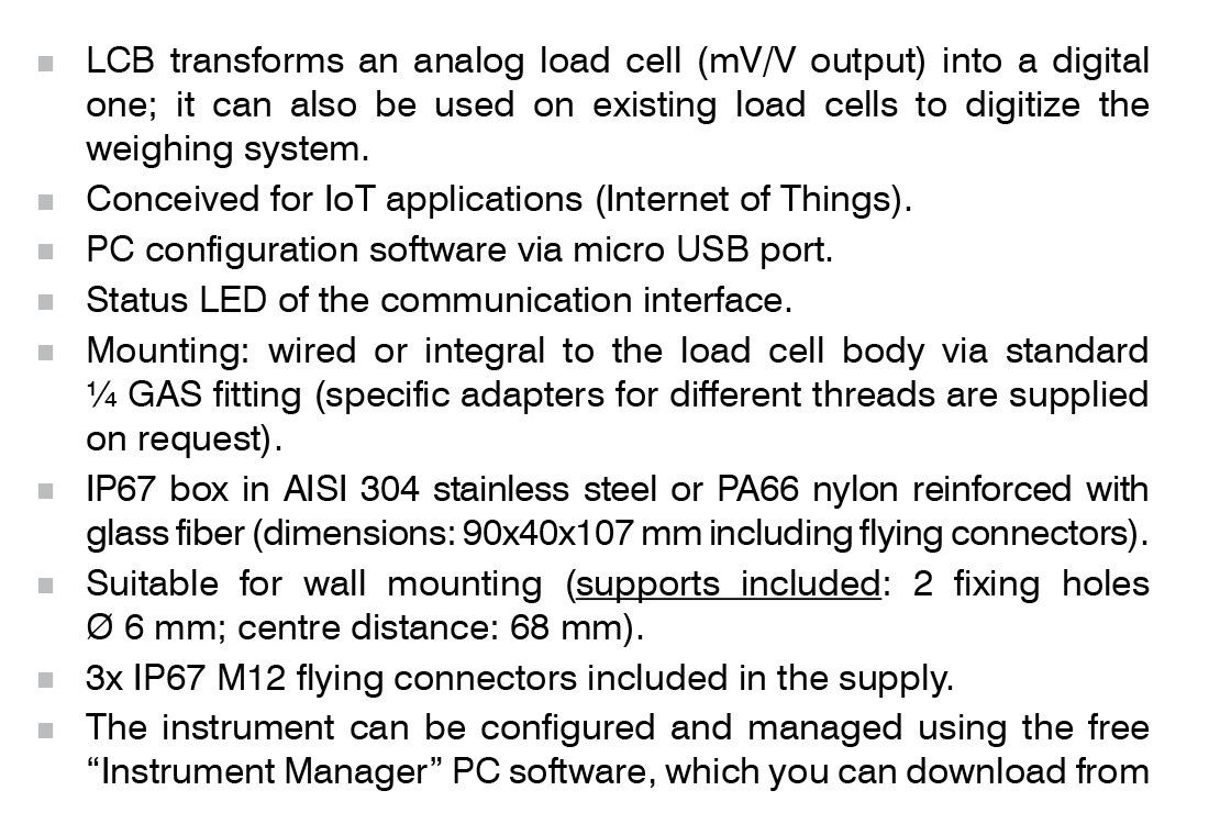 LCB Digitizer transforms an analog load cell (output mV/V) into digital and can also be used on existing load cells or strain gauge sensors. Designed for an assembly/wiring integral with the load cell body, it can be connected by fieldbus to PLCs of the most important international brands. The weight calculation frequency reaches up to 500 values a second and also the update frequency of the data on the fieldbus can reach the maximum speed of 500 updates a second, when using the PROFINET, EtherNet/IP and EtherCAT buses.
