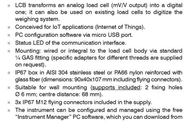 LCB Digitizer transforms an analog load cell (output mV/V) into digital and can also be used on existing load cells or strain gauge sensors. Designed for an assembly/wiring integral with the load cell body, it can be connected by fieldbus to PLCs of the most important international brands. The weight calculation frequency reaches up to 500 values a second and also the update frequency of the data on the fieldbus can reach the maximum speed of 500 updates a second, when using the PROFINET, EtherNet/IP and EtherCAT buses.