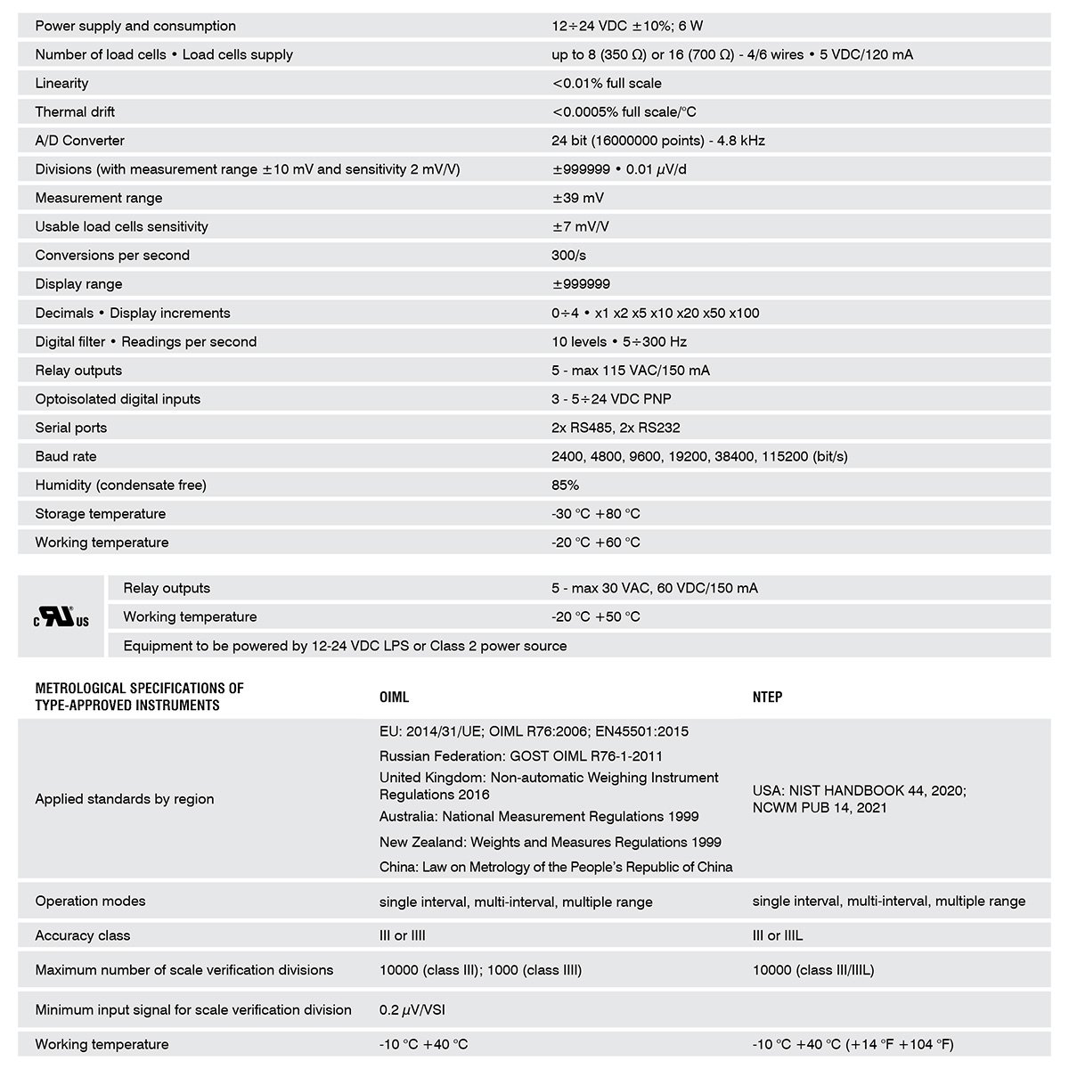 - OIML R76:2006 approved, class III, 10000 divis. 0.2μV/VSI