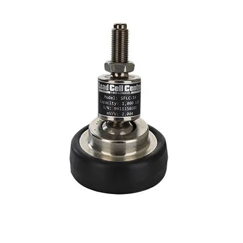 The SFLC scale foot load cell is designed to replace machinery feet and for converting objects such as tables, platforms, hoppers, and conveyors into electronic scales. The rubber foot provides vibration dampening and slip resistance. Made of alloy steel, the load cell is sealed to IP66 making it suitable for most industrial environments. The load cell has a 1/2″-20 UNF threaded stud. A scale is created by simply threading the load cells and jam nuts into place, attaching the load cell cables to a junction box, then to a load cell digital display, and performing a calibration. Systems are also available pre-calibrated from Load Cell Central.