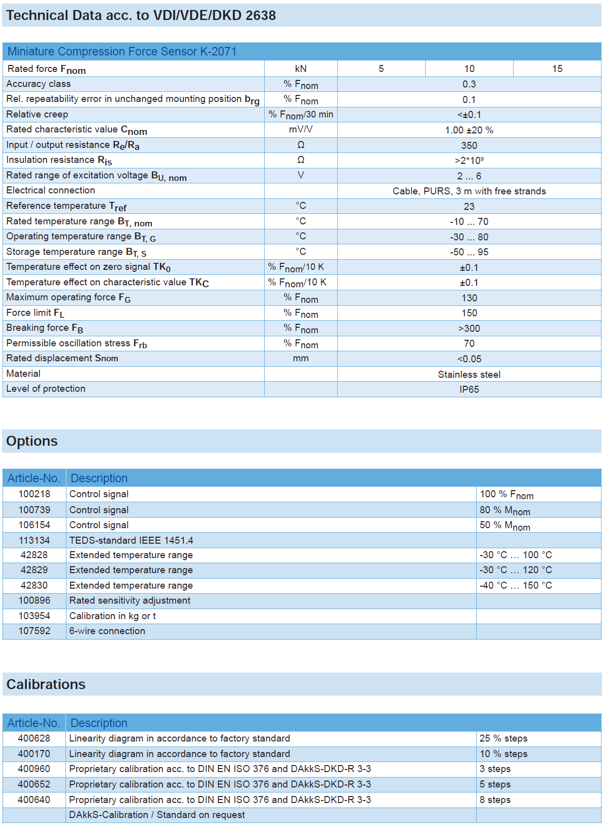 Miniature Compression Force Sensor K-2071 with Rated Force from 5 … 15 kN