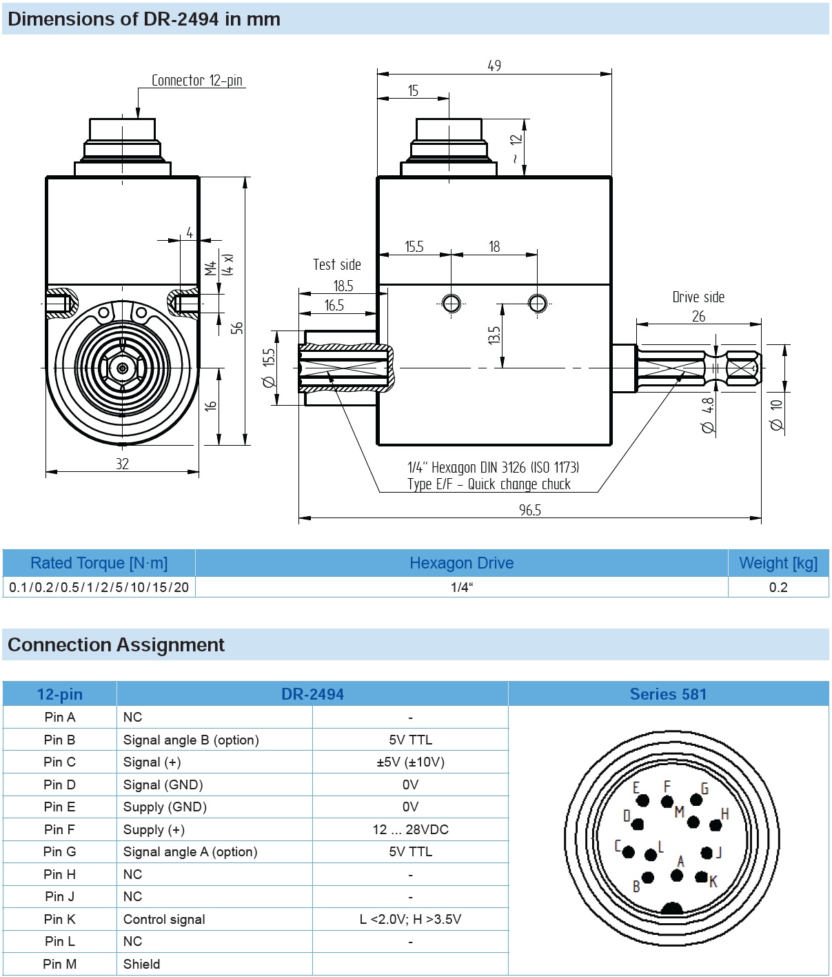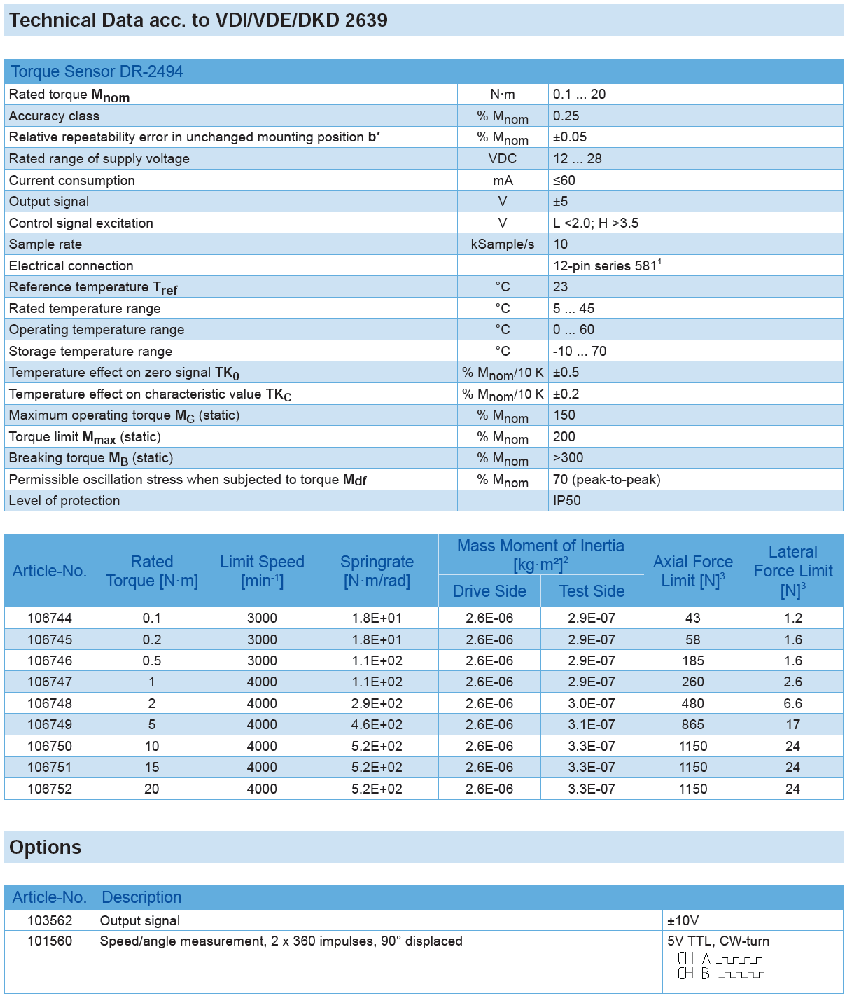 Rotating Torque Sensor DR-2494 (contactless) with Rated Torque from 0.1 … 20 N·m