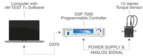 In this configuration example the power supply to the sensor is provided by the dynamometer controller. The DSP 7000 is a high speed programmable dynamometer controller. The analog only connection is used and data acquisition is supplied through a computer with M-TEST 7 software.
