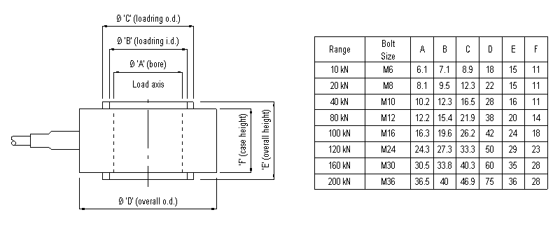It is designed for easy installation, usually between two flat faces bearing on its loading rings, either unattached or with retaining spigots positioned in the centre hole. Alternatively tensile load transfer can be achieved via a tie rod assembly through the centre hole. In this way the loadcell can indirectly measure tensile loads in a “fail-safe” mode.