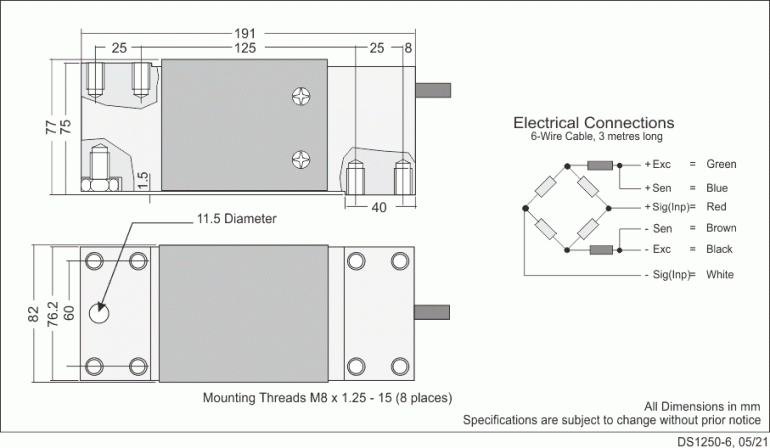 The 1250 load cell is fitted with a 6 core shielded cable as standard. Special cables and lengths are available on request.