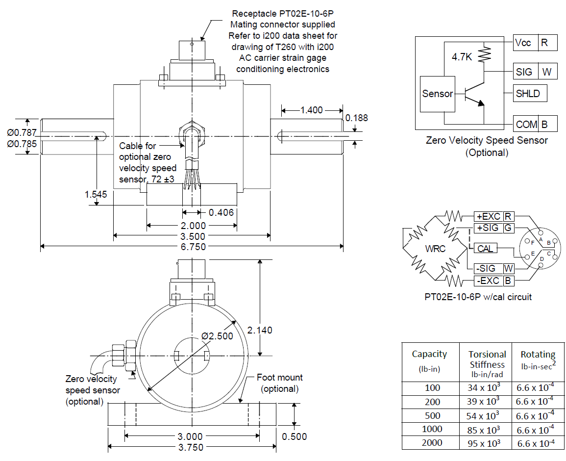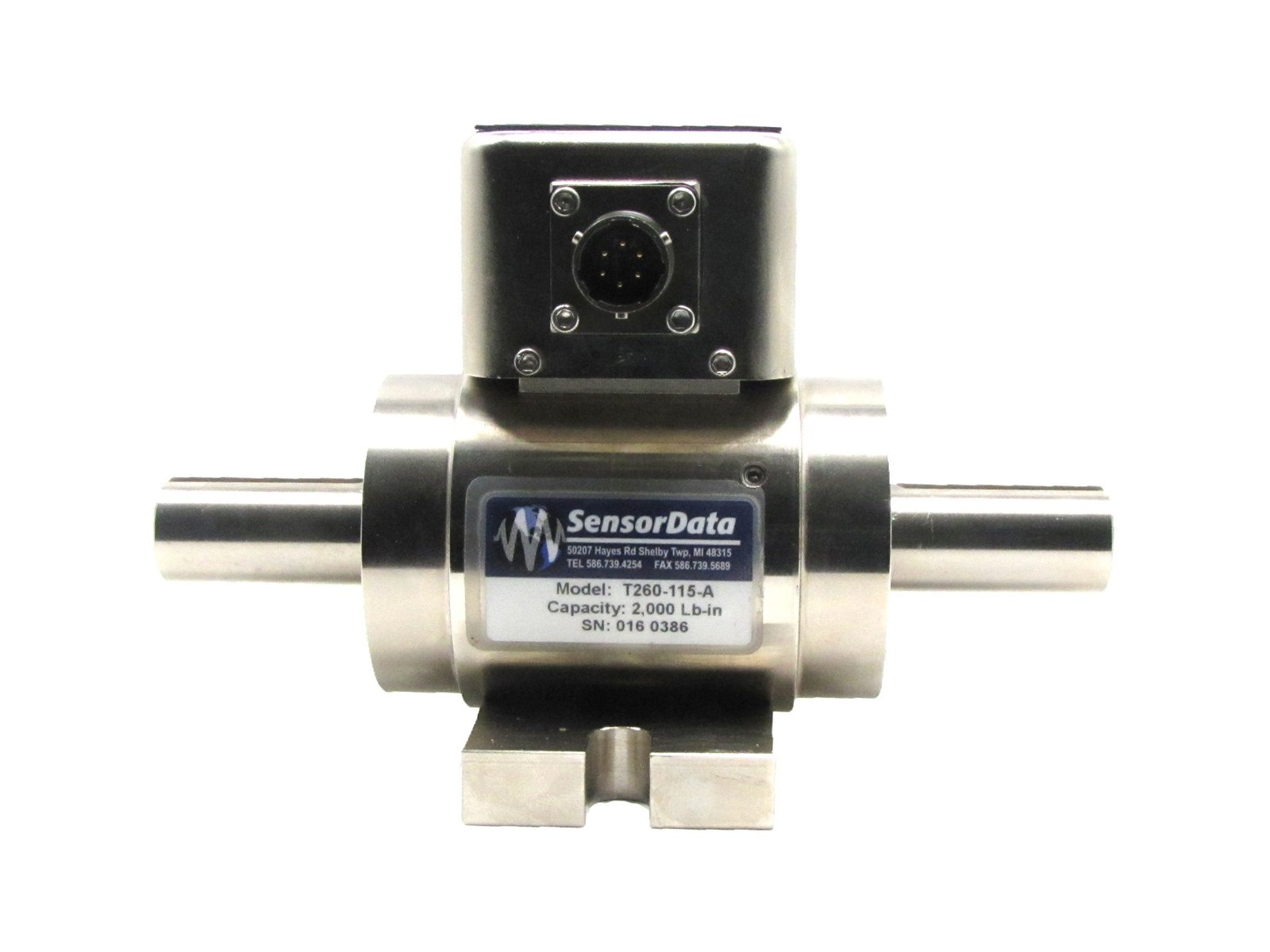 The T260 rotary transformer coupled torque sensor was designed for the measurement of viscosity and for in-line testing of motors, engines, transmissions, propellers, pumps, drivelines, and similar rotating devices. The T260 has 20% to 40% greater stiffness, has 4 to 6 times less rotating inertia, and is 1/3 the size of comparable models available from other suppliers. The T260 requires the use of AC carrier strain gage signal conditioning electronics such as SensorData’s I200. The optional zero velocity speed sensor is installed inside the T260 housing. Interconnecting cable assemblies are available as an option. SensorData will provide in-house calibration of the T260 with customer-supplied electronics for a fee.