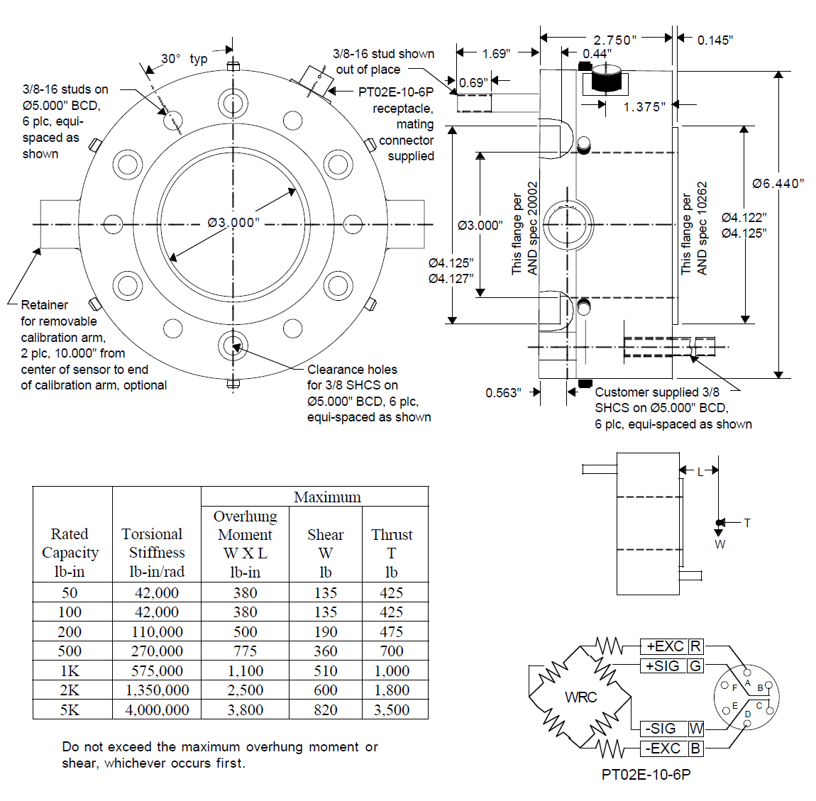 accurately measure the non-rotating reaction torque values where the rotating member of the device under test is passed through the center of the sensor. The T123 with inherent low-end measurement capability can be installed at the driver or absorber end of the measurement chain. The flanges, pilot diameters and bolting studs of the T123 are configured to AND standards. AC carrier or DC strain gage signal conditioning electronics can be used with the T123. A removable calibration arm and interconnecting cable assemblies are available as options. In-house calibration of the T123 with SensorData electronics will be provided free of charge or with customer-supplied electronics for a fee.
