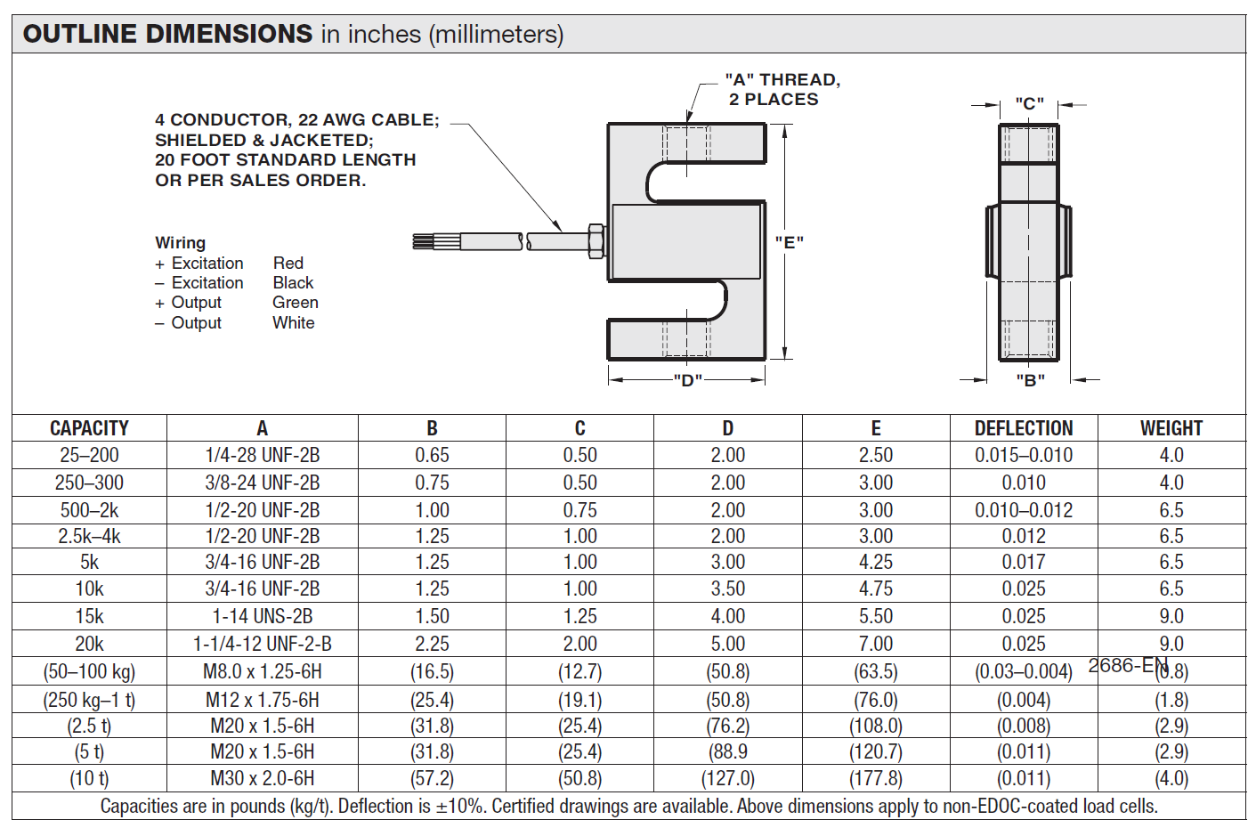 | Rated output tolerance lbs | 25–3k: +25 / –10 5k–20k: ±0.25 | % | |||