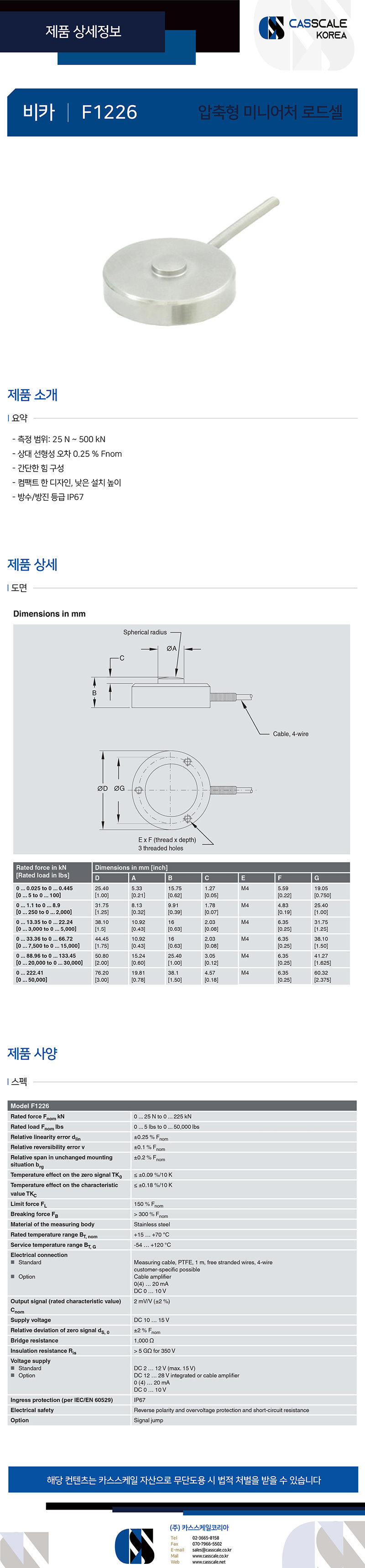 압축형 미니어처 로드셀 F1226 250lb / 500lbs / 1,000 lbs / 2,000 lbs / 5,000 lbs / 10,000 lbs